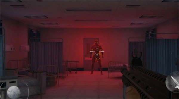 1、在一开始我们来到医院当中,首先左右查看四周,之后走向大门。接着进行瞄准,干掉两个小怪物。