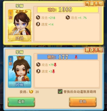 3、遣散具备碎片回收功能,武将碎片回收后,可获取一定数量的将星石、武将经验以及武将精魄等道具。