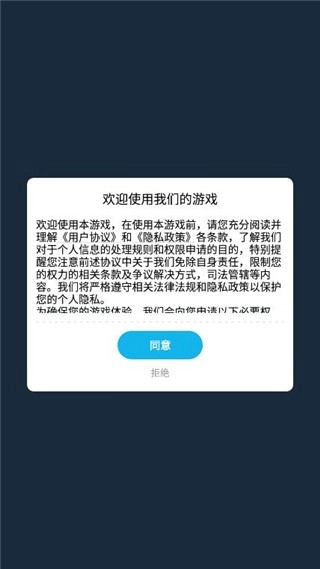 1、首次在设备上完成游戏安装并打开后,如以下图示,点击同意按钮。
