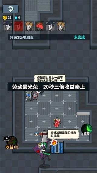 2、玩家置身此地,会遭遇诸多敌人。在开局选定角色后,玩家需先通过摸鱼睡觉的方式进行发育,进而打造更多武器与道具,以阻拦管理者闯入。