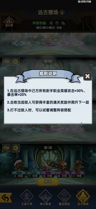 在四种爬塔模式里,王座之塔属于常驻模式,没有限制条件。骑士殿堂、魔法遗迹以及远古猎场这三个模式则是交替开放,每天最多仅开放其中一个模式,且每次开放时,玩家最多能够挑战二十层。这三个限时爬塔玩法各自具备一定的增益效果:骑士殿堂会提升战士的双抗;魔法遗迹能增加法师的攻击与攻速;远古猎场可提高射手的攻击和暴击率。各位冒险者在参与限时爬塔时,可依据这些增益效果来合理调整自身阵容。
