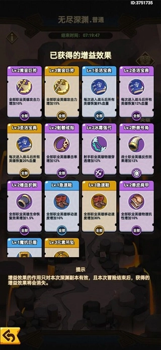 无尽深渊设有普通与噩梦两种模式。在此模式下,骑士团通关关卡后,英雄血量不会重置,玩家能够从随机系统分配的增益里挑选一个,还能通过看视频的方式刷新增益,甚至获取全部增益,直至所有英雄血量耗尽。当挑战该模式前期未刷到圣洁宝典时,建议尽量安排一名治疗型辅助,以此保障队伍的整体状态;到了后期,则可多选择几本圣洁宝典,确保在挑战关卡时队伍能维持良好状态。