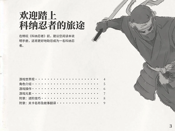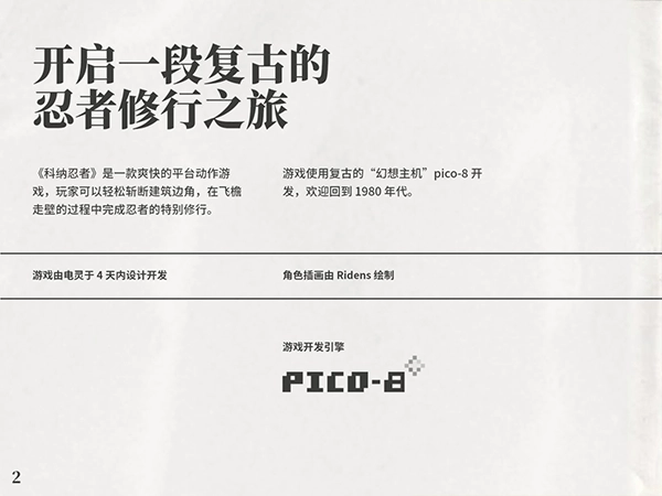 欢迎来到1980年代,在虚构的幻想主机Pico - 8上,体验一款当时并不存在的复古游戏——《科纳忍者》。赶快行动起来,翻开《〈科纳忍者〉游戏说明手册》,搞清楚这款游戏究竟该怎么玩吧!