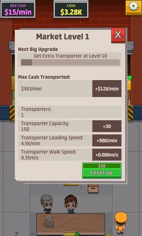 5、对市场进行升级,增添运输车,提升最大运输量,加快运输车的速度,同时增加运输工人数量。