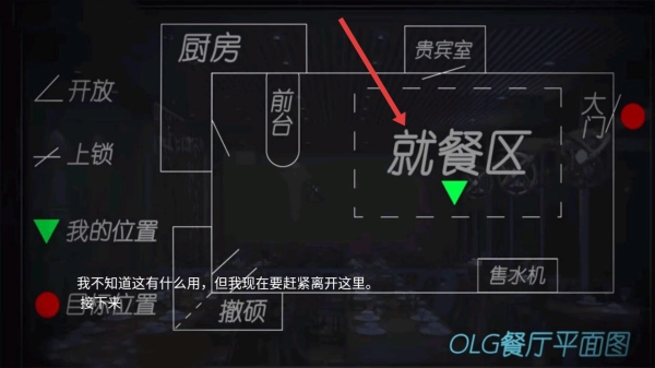 2. 依据OLG餐厅的平面图,明确所处位置,规划探索或逃离路线,优先朝着大门方向行动,尝试脱离当前区域。