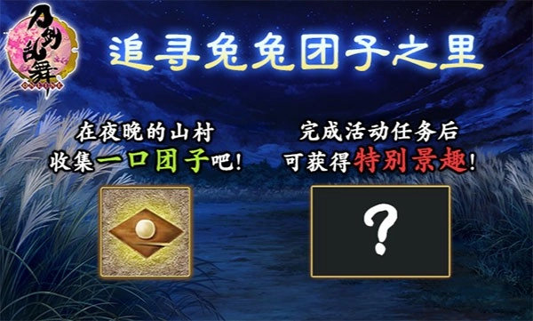 审神者在出阵过程中偶尔能发现兔子的身影,通过击败敌人、追踪兔兔或是击破BOSS,都有机会得到活动道具【一口团子】。给刀剑男士使用【一口团子】,不仅能大幅缓解一位刀剑男士的疲劳状态,还能听到全新的专属语音;完成“对刀剑男士使用50个一口团子”的活动任务后,就能获取中秋特别景趣。