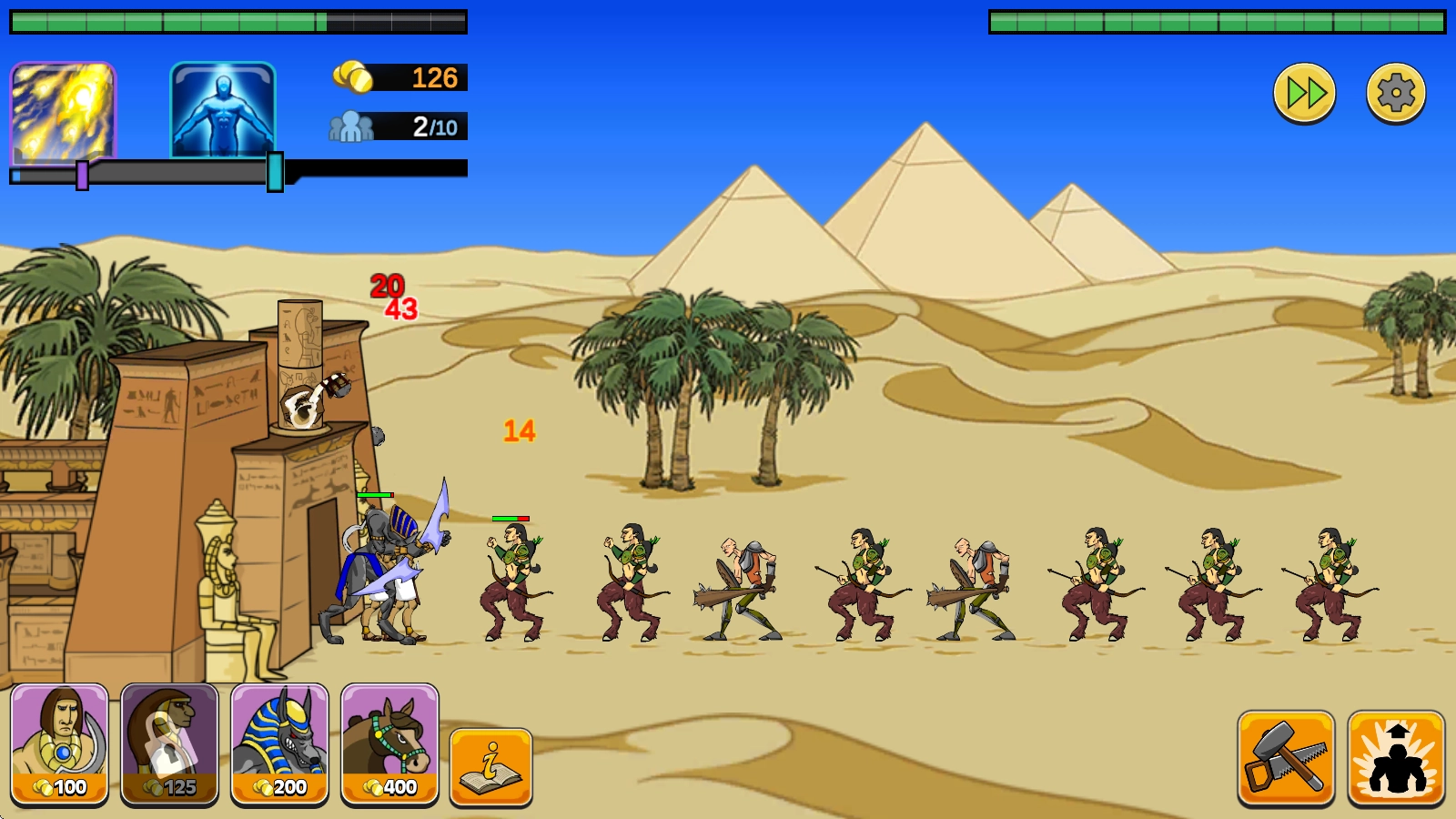 战争时代2(Age of War 2)是一款以古埃及文明为核心主题的趣味塔防游戏。在游戏进程中,玩家需要持续召唤各类战士参与战斗,同时可借助升级系统逐步增强自身战斗力;此外,还能通过不断推进文明阶段来提升战士的整体素养——从早期文明的野蛮人战士,到中世纪配备各类火器的士兵,再到使用现代武器的军队,甚至会出现来自未来的机器人战士!游戏整体战斗节奏十分紧凑,玩法内容刺激有趣,并且提供多种不同难度可供挑战,让玩家尽情享受其中的乐趣!