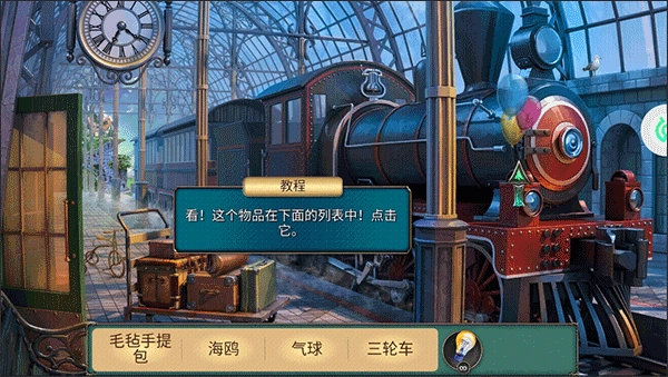 根据下方给出的物品提示找出它们在图中的位置,涉及的物品有毛毡手提包、海鸥、气球和三轮车,你也可以点击灯泡来获取有限的提示。