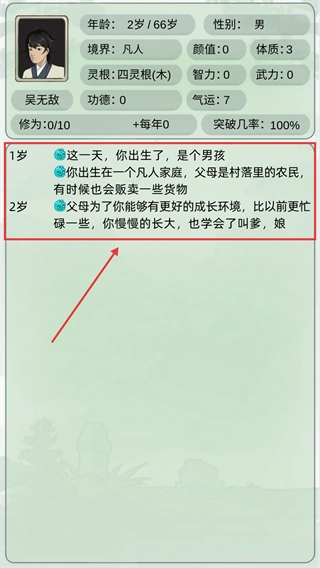进入游戏后打开角色属性面板,留意【境界-凡人】【灵根-四灵根木】这类初始属性,知晓出生家庭背景对角色成长的作用。