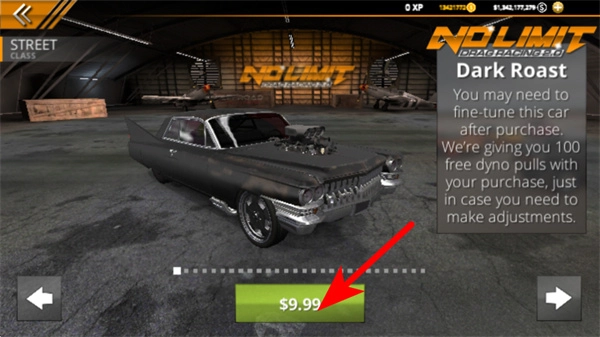 点击箭头所指的购买按钮,这是获取目标车辆的必要步骤,点击后会消耗相应资源来解锁该赛车,以便用于后续的比赛。