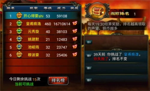 PVP系统正式开启!排名越靠前,能拿到的奖励就越丰厚。每天有15次挑战机会,即便挑战失败,也能获得声望和铜币奖励,推荐大家每天把次数用完。