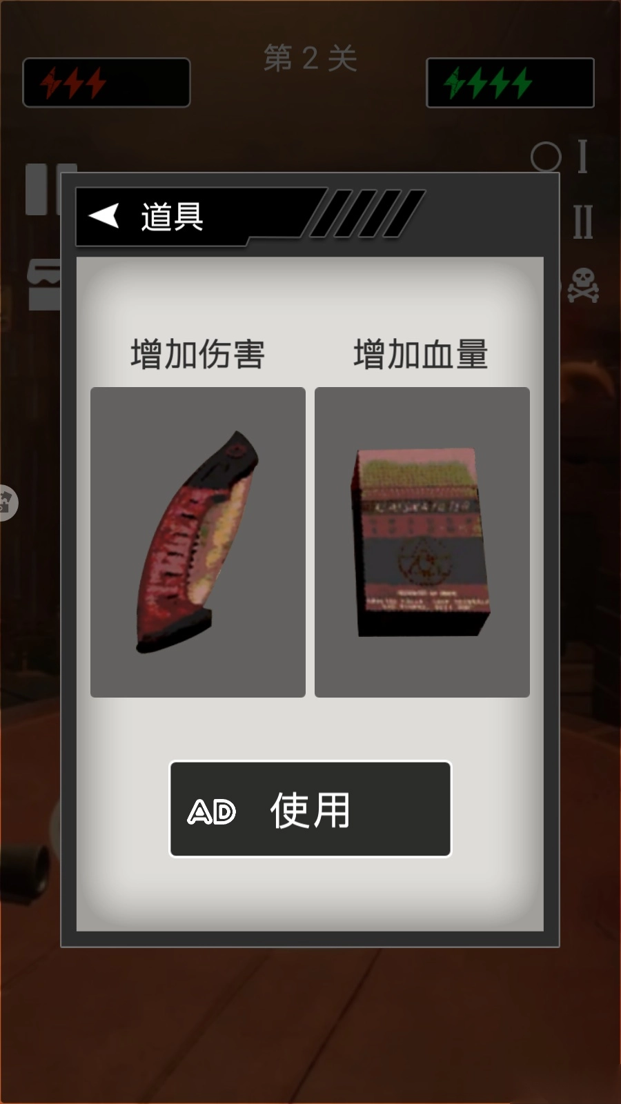 提供道具供玩家使用,玩家可在游戏中使用能提升伤害的道具,每次对决会损失两条生命。
