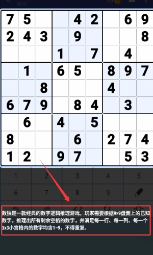 点击红框箭头指向的开始游戏按钮,进入数独世界。