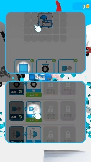 1.进入车库后,可自主挑选车身、轮子、护甲、引擎、武器等各类配件来进行组装。
