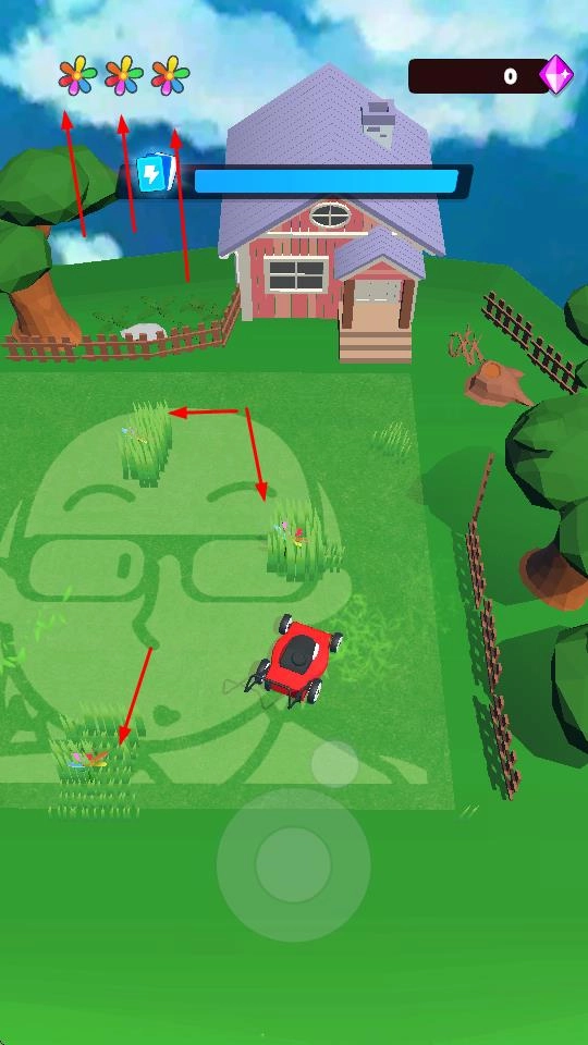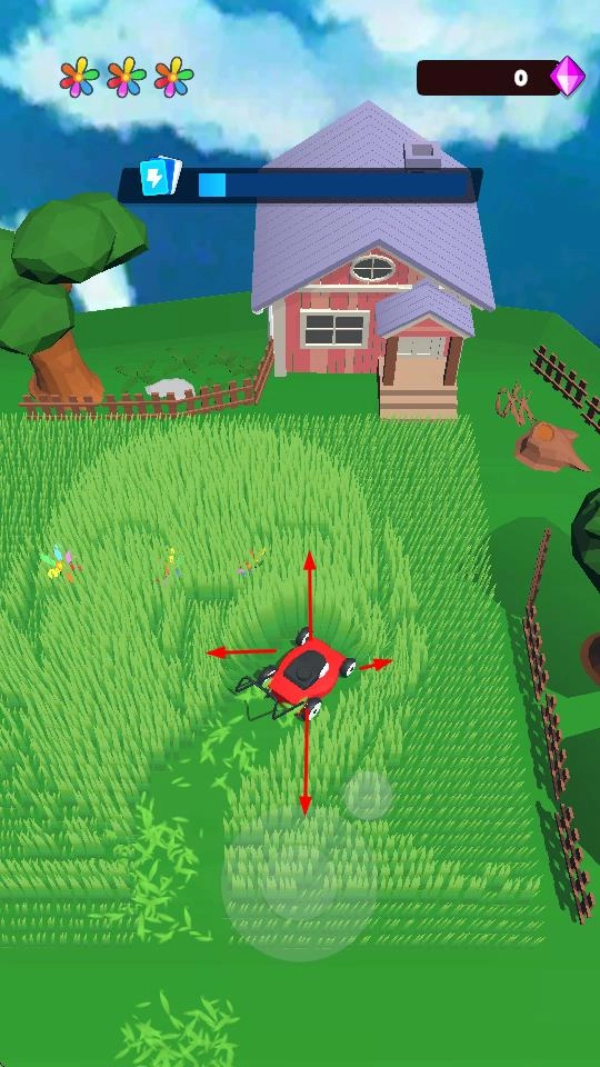 1、操控红色割草机在草地上移动,这是开启游戏的关键操作,顺利开启割草之旅。