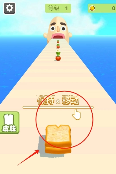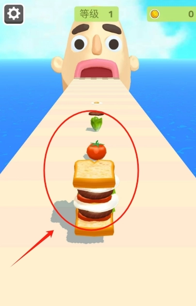 1、滑动屏幕开启游戏,托着三明治一路飞奔,左右移动躲开障碍,要是手滑了可就全洒出来啦。