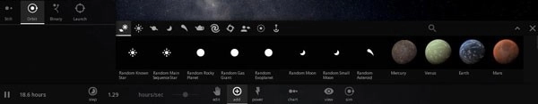 要添加物体,只需点击add按钮,随即会弹出如下界面:在该界面中,可添加的物体类型包括行星、恒星、卫星、星系、黑洞、日常物体以及航天器等。你可以先点击自己想添加的物体,再将其放置到这个空间里;从理论上来说,这个空间能够容纳的物体数量是没有上限的。