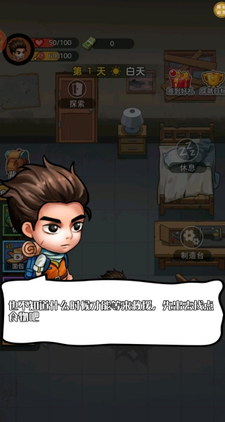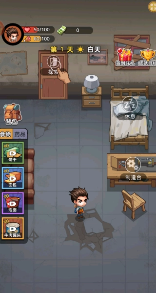 3.开启“第一天求生”任务后,点击【探索】按钮就能外出活动,在废墟里搜寻食物和武器,增强战斗力来抵挡丧尸的攻击。