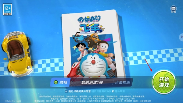 1、启动哆啦A梦飞车应用,使用手机号完成游戏登录操作,接着挑选对应的服务器,最后点击“开始游戏”按钮进入游戏;