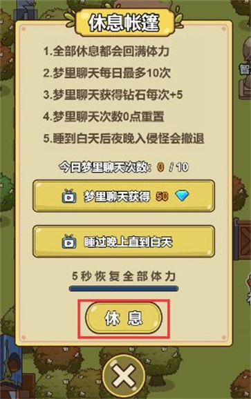 8、最后,在设置里有个重新开始的选项。要是开局不太顺利,那就选择重新开始吧。当体力不足时去挖矿或者砍树,操作就会失败(出现MISS)。体力进度条显示在左上角,回家找到帐篷并睡一觉,体力就能恢复满值了。