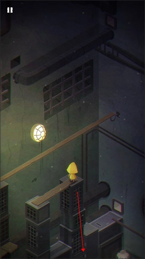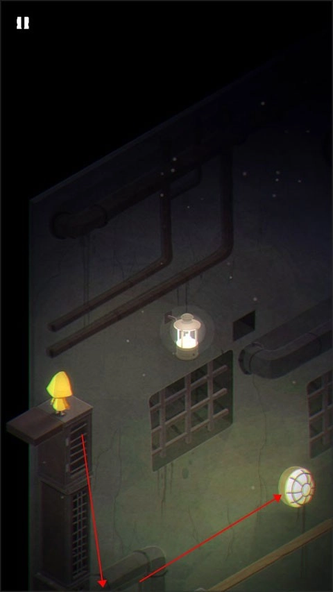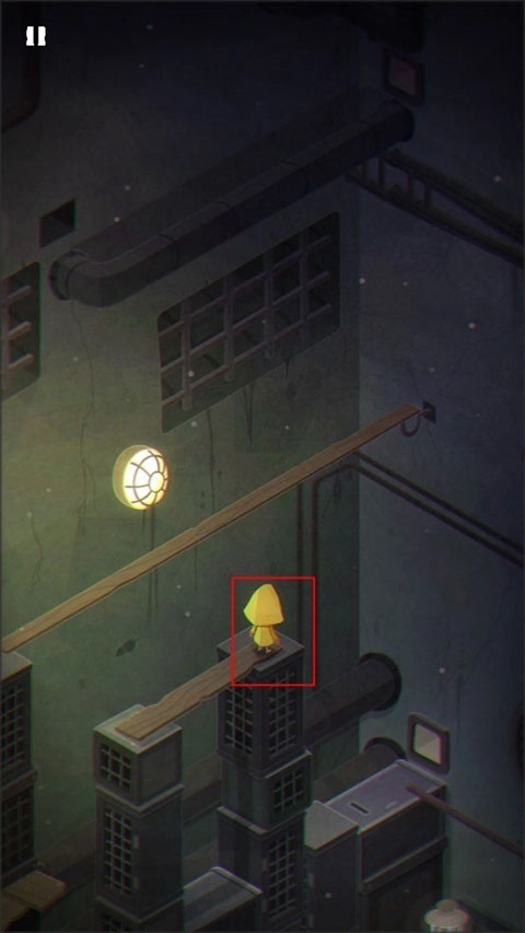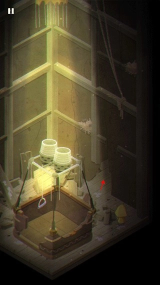 游戏的开端,摩诺正用门抵御着外界的攻击;来到第一关,他身处一个形似篮子的空间里,得按住上方的拉杆才能让自己落到地面。
