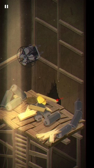 6、摩诺避开木桶,顺着楼梯向上攀爬,使劲挪开这两块木板,就能进入下一个关卡了。