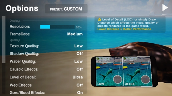 1、打开鲨鱼之怒游戏,在游戏开始前点击右上角齿轮按钮可调整游戏画质、画面效果等;