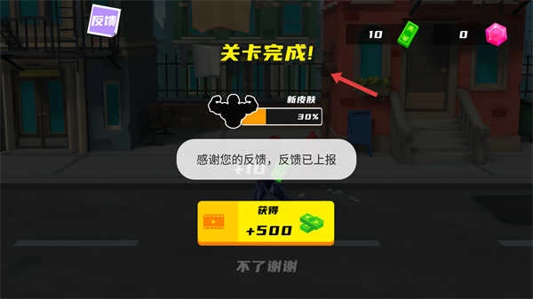 关卡通关后会得到金币奖励和新皮肤的进度积累,你可以按照提示选择是否观看视频来获取额外奖励,以此积累资源提升角色的战斗力。