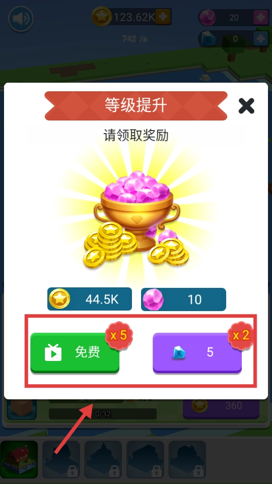 等级提升后,可选择【免费】看视频或直接获得钻石。