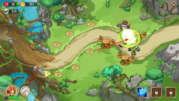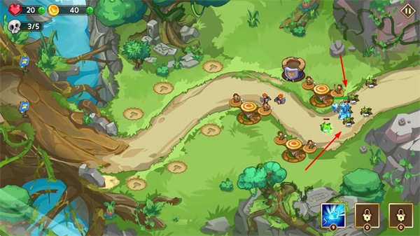 在卡通风格的森林场景里,把防御塔安置在道路旁的空地上,以此阻拦敌人的行进。