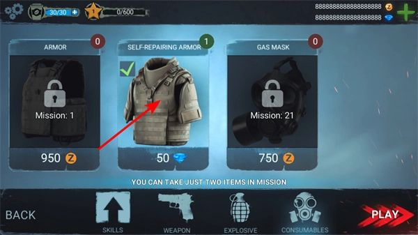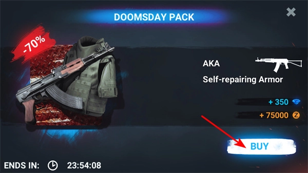 点击BUY按钮即可购买DOOMSDAY PACK礼包,该礼包内含AKA步枪与自修复护甲,同时附赠钻石和金币,能够助力游戏进程推进。
