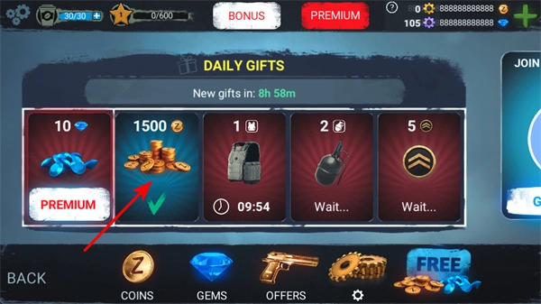 每天记得领取礼物里的1500金币,这些金币能用来买装备、升级技能,是攒资源的重要方式,得确保资源够花。