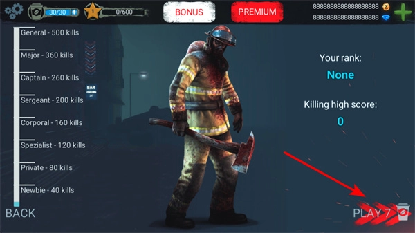 点击PLAY按钮即可进入游戏,在战斗中消灭敌人,通过累积消灭敌人的数量来提升军衔,军衔提升后能够解锁新的技能和奖励。