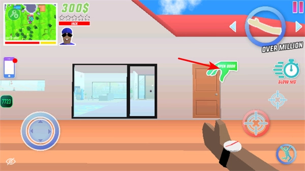 按照“OPEN DOOR”的提示打开房门,进入建筑内部后探索新区域,以此来触发任务或获取资源。