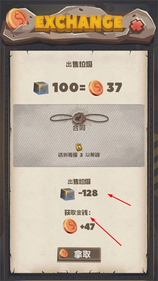 进入EXCHANGE界面后,你可以通过出售垃圾来获取金钱,不同数量的垃圾会带来不同的金钱收益,点击“拿取”按钮就能领取出售垃圾所获得的金钱。