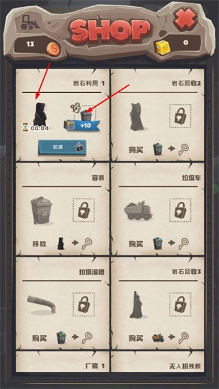 在SHOP商店界面,你可以用积攒的金币购买各种设施,以此增强垃圾处理的能力与效率,从而推动游戏里垃圾处理业务的发展。