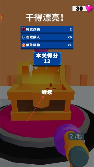 持续开火,清除一波接一波出现的敌人,留意屏幕右下角武器的射击速度,比如2次每秒。