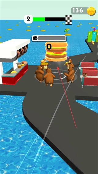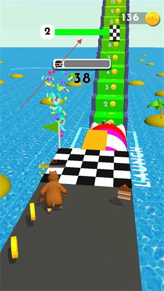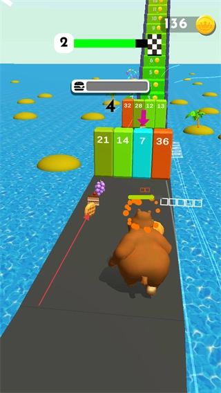进入游戏后,你需要操控角色向前移动。屏幕上方的绿色进度条显示着当前关卡的推进情况,数字“2”大概率是关卡的序号,而“136”则代表你目前拥有的金币数量。