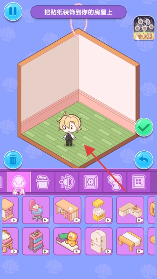 2、进入房屋装饰界面后,挑选合适的贴纸与家具,比如地板贴纸、各式家具等,对房屋进行装饰布置,以此提升房屋的美观程度,从而达成任务目标。