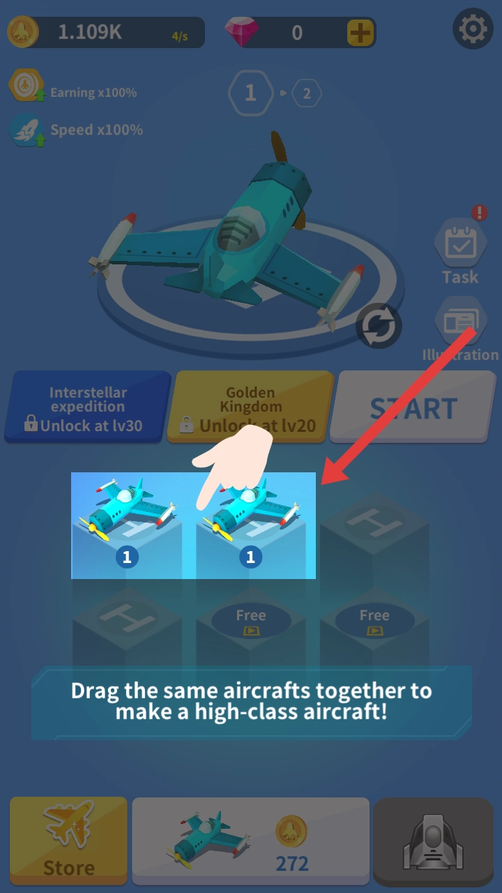 拖动2架同型号显示等级1的蓝色战机进行合并,可以合成高阶战机Lv.2Wright-A,提升战力。