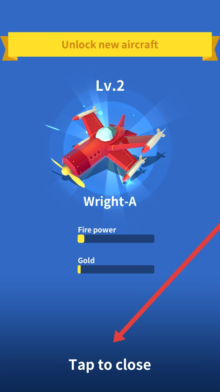 解锁新战机后,点击界面底部Tap to close的提示文字,关闭战机的属性展示弹窗,回归界面继续操作。