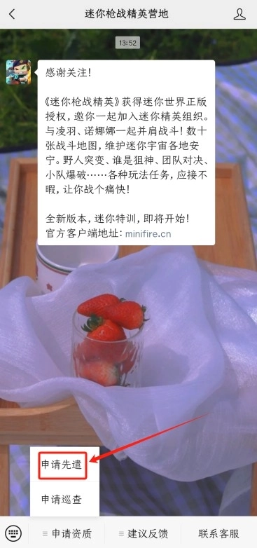 3、接下来打开微信,搜索“游戏营地”的相关入口,点击申请资格并通过审核后,就能正式进入先遣服进行体验了。