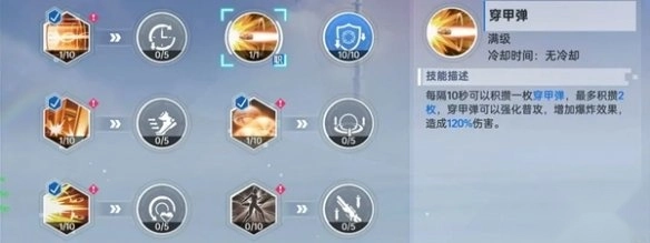 枪神的核心技能是穿甲弹。这个技能让枪神每10秒能积攒一枚穿甲弹,最多能存两枚。用穿甲弹能强化普通攻击,让普攻带有爆炸效果。等额外能力升到满级后,被穿甲弹击中的目标防御力会下降。