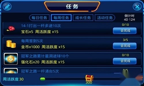 按时完成任务,提高活跃度,每天都有机会获得A级和S级球杆的碎片。