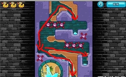 游戏里新加入了鸭子,我们除了要引水,还得把鸭子送到鳄鱼宝宝的浴缸中,让宝宝高兴起来。路线我已经截好图了,大家看下面。
