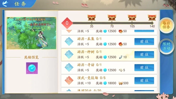 2、完成种植后,就能领取种树奖励,拿到亮闪闪的元宝啦!还有机会获得珍稀的羲和五铢币奖励,做完每日任务也能领取丰厚奖励哦!(这些奖励可用于提升经验、强化装备和增加活跃度)