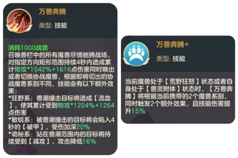 驯兽师通用大招——万兽奔腾:释放需消耗1000点战意,且该技能无冷却时间。只要战意值充足,就能随时施展。技能效果会依据魔兽所属品系的差异而有所不同。