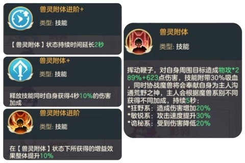 通用被动技能“驯兽之力”:驯兽师具备捕捉魔兽的能力,最多可同时让两只魔兽参与战斗,且出战魔兽的种类会对技能效果产生影响。