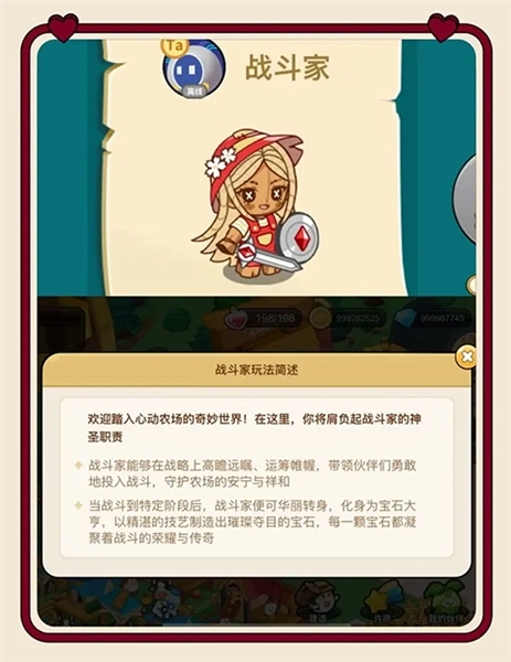 游戏里有战斗家和农场主两种职业可选。战斗家果敢勇猛,负责保卫农场的和平;农场主精心打理,为农场的发展筑牢根基。这两个职业彼此协作,一起创造出独特的农场天地,玩家能根据自己的偏好来选择,开启专属于自己的农场冒险。