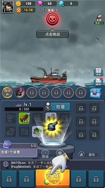 1、进入游戏界面后,点击【合成】按钮就能得到随机装备。这些装备本身带有属性值,要是合成出了高等级的装备,你可以直接把它装配到战舰上,这样能让战力得到显著提升。